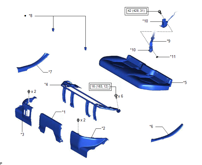 | *7 | REAR DOOR SCUFF PLATE RH | *8 | REAR SEAT CUSHION LOCK HOOK |