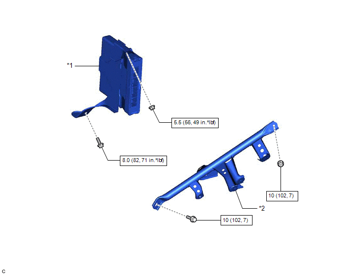 | *1 | HYBRID VEHICLE CONTROL ECU | *2 | NO. 3 INSTRUMENT PANEL TO COWL BRACE SUB-ASSEMBLY |