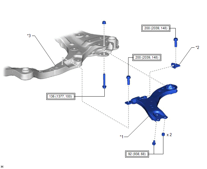 | *1 | FRONT LOWER NO. 1 SUSPENSION ARM SUB-ASSEMBLY | *2 | FRONT LOWER ARM BUSHING STOPPER |