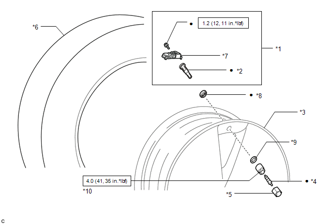 | *1 | TIRE PRESSURE WARNING VALVE AND TRANSMITTER | *2 | TUBELESS TIRE VALVE |
