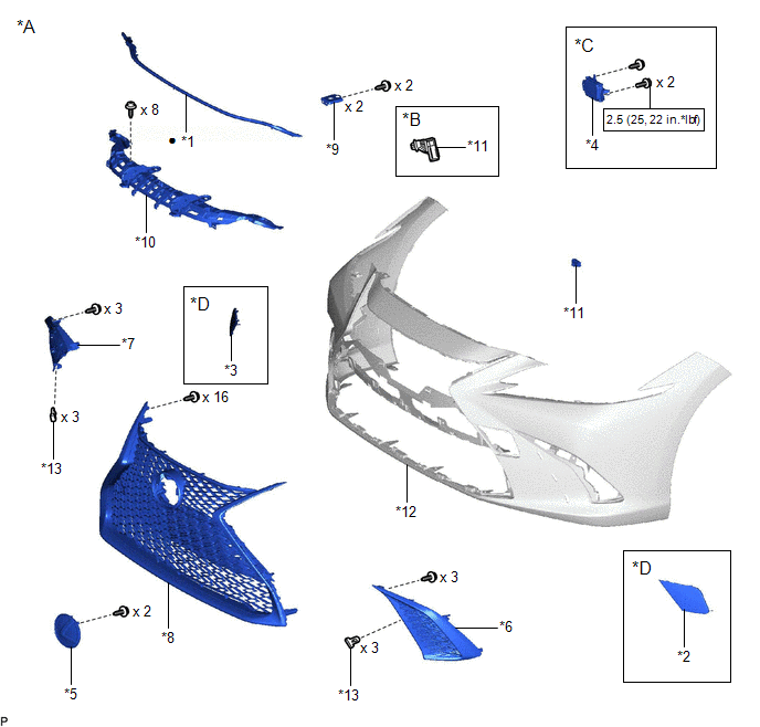| *11 | RADIATOR GRILLE SUB-ASSEMBLY | *12 | UPPER FRONT BUMPER RETAINER |