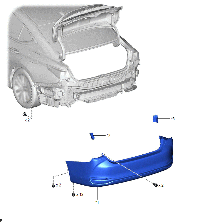 | *1 | LOWER REAR BUMPER SIDE RETAINER LH | *2 | NO. 2 REAR BUMPER SIDE SUPPORT LH |