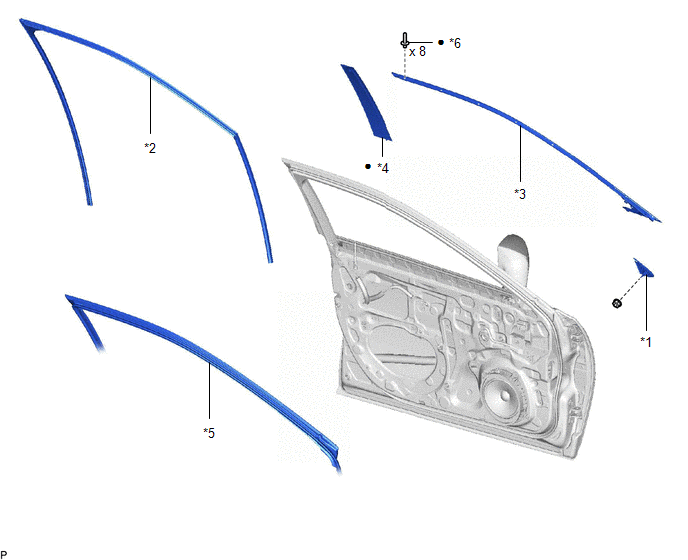 | *3 | FRONT DOOR OUTSIDE MOULDING SUB-ASSEMBLY | *4 | FRONT DOOR REAR WINDOW FRAME MOULDING |