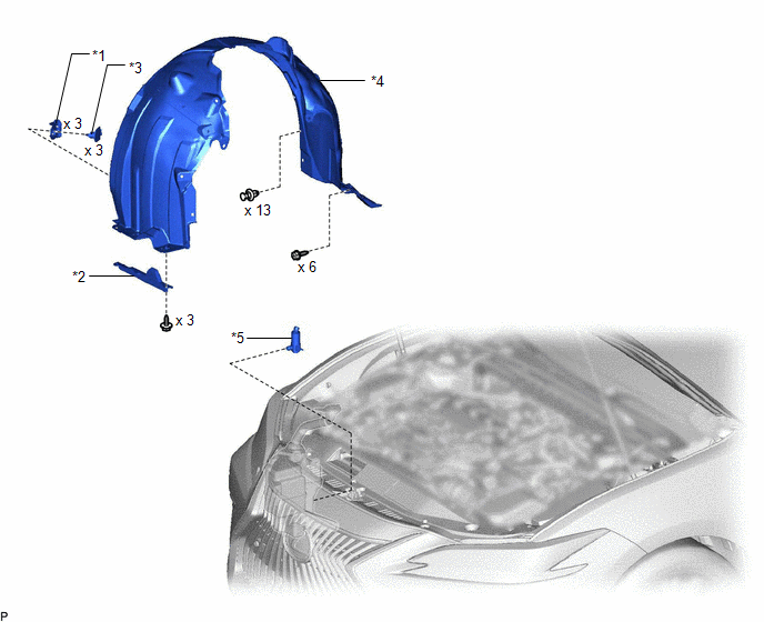 | *1 | FRONT FENDER LINER RETAINER | *2 | FRONT WHEEL OPENING EXTENSION PAD RH |