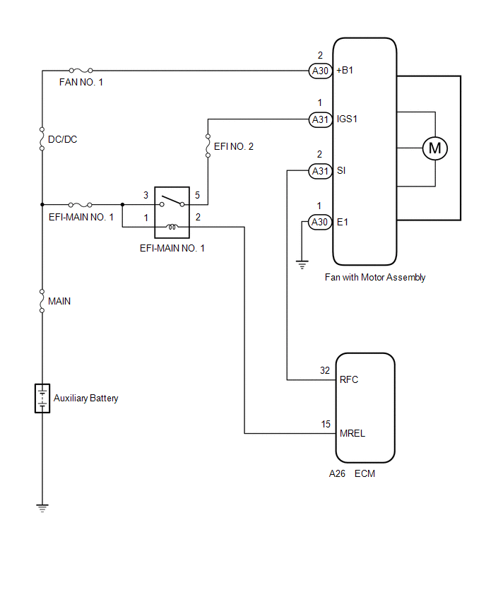 | NG | | REPAIR OR REPLACE HARNESS OR CONNECTOR (FAN WITH MOTOR ASSEMBLY - EFI-MAIN NO. 1 RELAY) |