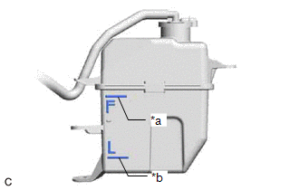 | (a) Check that the engine coolant level is between the L line and F line when the engine is cold. If the engine coolant level is low, check for leaks and add engine coolant to the F line. NOTICE: Do not substitute plain water for engine coolant. |