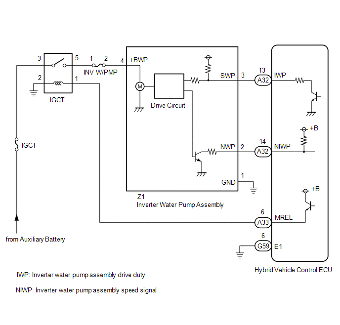 HINT: Check the condition (looseness, deterioration, etc.) of the wire to body ground for the inverter water pump assembly. |