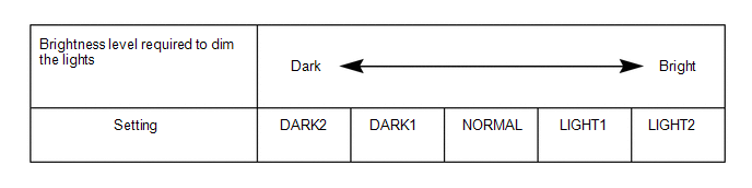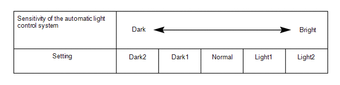 | Sensitivity | Adjusts the sensitivity of the automatic light control system.*C | Normal | 000:Normal,001:Dark2,010:Dark1,011:Light1,100:Light2 | Main Body ECU (Multiplex Network Body ECU) |