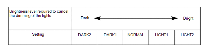 | Disp Ex ON Sen | Changes the ambient brightness level required to dim the lights such as the indicator lights of the combination meter, A/C indicator light and clock.*A | NORMAL | 000:NORMAL,001:DARK2,010:DARK1,011:LIGHT1,100:LIGHT2 | Main Body ECU (Multiplex Network Body ECU) |