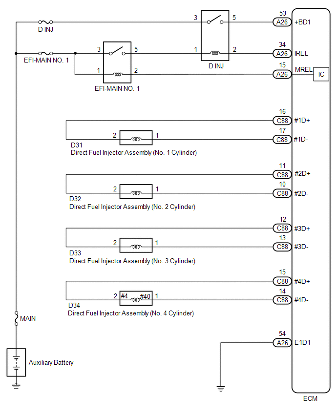 | NG | | REPAIR OR REPLACE HARNESS OR CONNECTOR (EFI-MAIN NO. 1 RELAY - D INJ RELAY) |