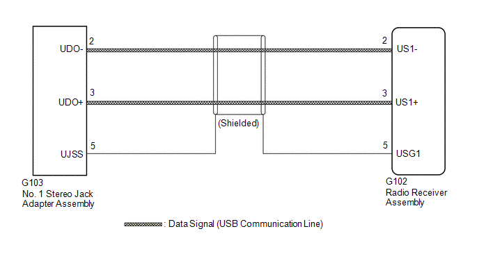 The No. 1 stereo jack adapter assembly sends the sound data signal or image data signal from a USB device to the radio receiver assembly via this circuit.