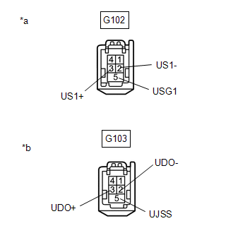 | (c) Measure the resistance according to the value(s) in the table below. Standard Resistance: | Tester Connection | Condition | Specified Condition | | G102-2 (US1-) - G103-2 (UDO-) | Always | Below 1 Ω | | G102-3 (US1+) - G103-3 (UDO+) | Always | Below 1 Ω | | G102-5 (USG1) - G103-5 (UJSS) | Always | Below 1 Ω | | G102-2 (US1-) or G103-2 (UDO-) - Body ground | Always | 10 kΩ or higher | | G102-3 (US1+) or G103-3 (UDO+) - Body ground | Always | 10 kΩ or higher | | G102-5 (USG1) or G103-5 (UJSS) - Body ground | Always | 10 kΩ or higher | | | | *a | Front view of wire harness connector (to Radio Receiver Assembly) | | *b | Front view of wire harness connector (to No. 1 Stereo Jack Adapter Assembly) | | |