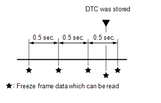 (b) The Techstream records freeze frame data in 5 different instances: 1) 3 times before a DTC is stored, 2) once when a DTC is stored, and 3) once after a DTC is stored. These sets of data can be used to simulate the vehicle condition around the time when the malfunction occurred. The data may help in diagnosing the malfunction, or in judging if the DTC was stored due to a temporary malfunction.