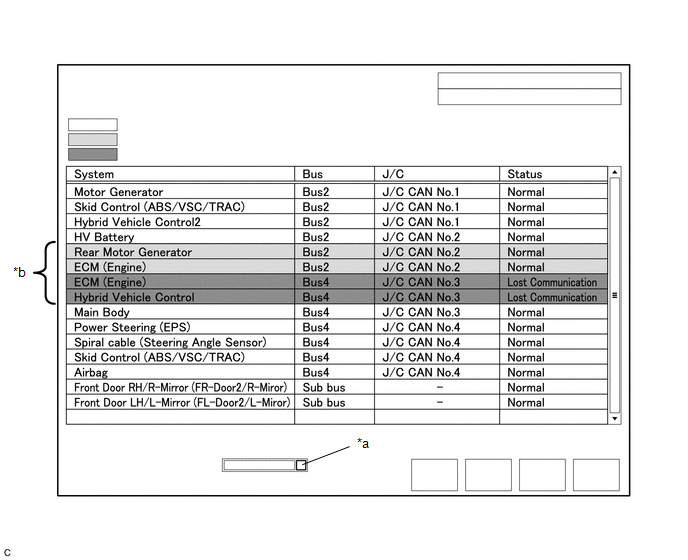 (b) Confirm that the "Communication Bus Check" screen is displayed and the ECUs and sensors that are normally connected to the CAN communication system are displayed.