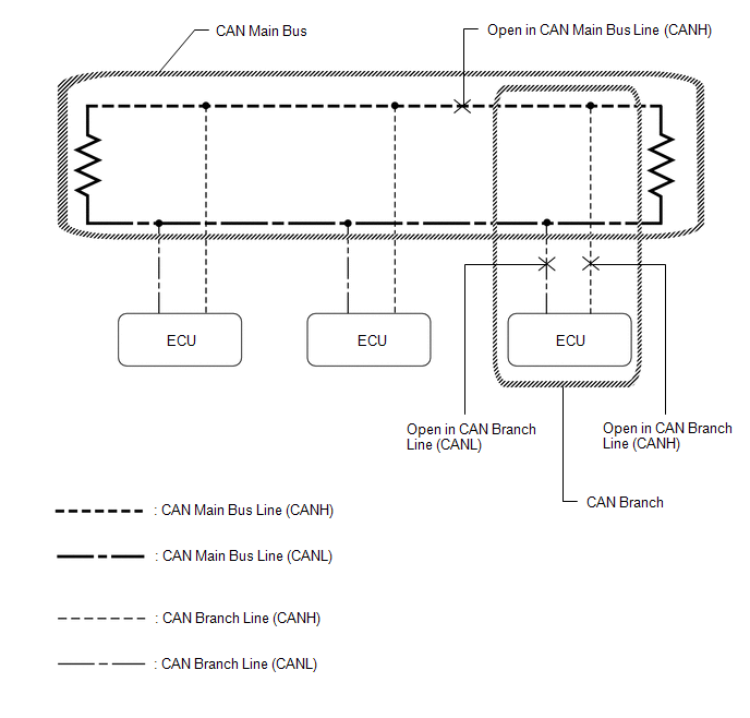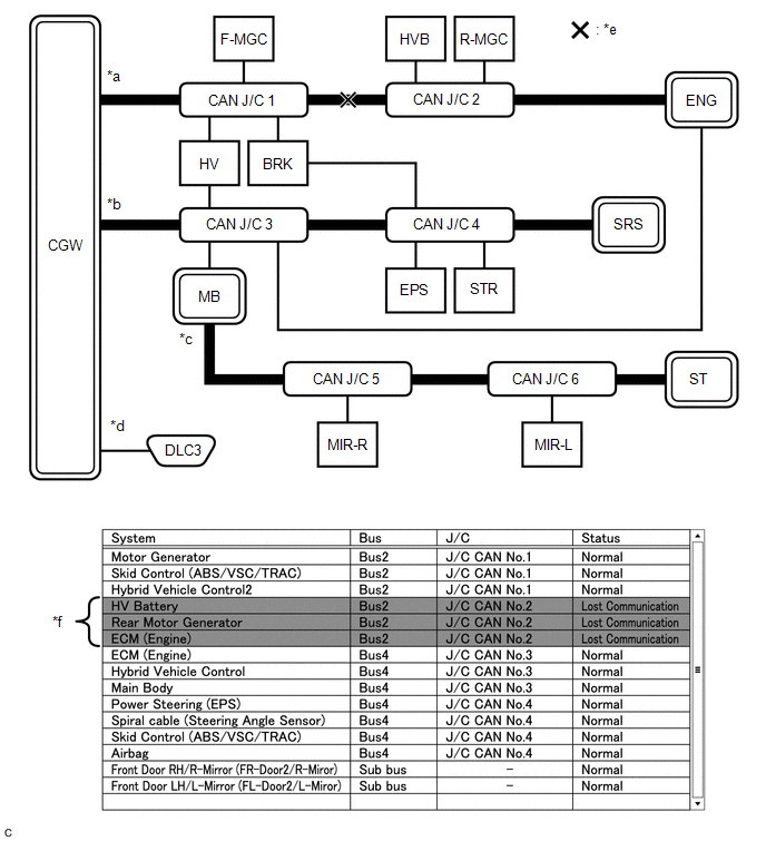 | Sub bus with a gateway function equipped ECU that does not memorize connected ECUs or sensors*2 | White | Communication has been normal since the start of the CAN bus check. |