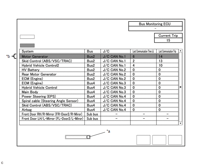 | Lost Communication Trip | Displays the trip in which the longest period of time that the ECU or sensor connected to the central bus was not communicating occurred. |