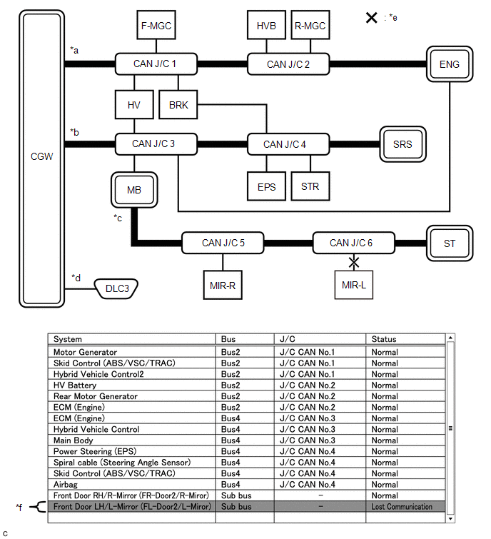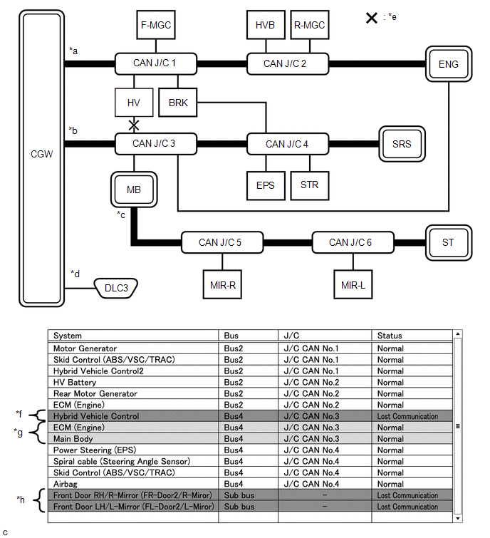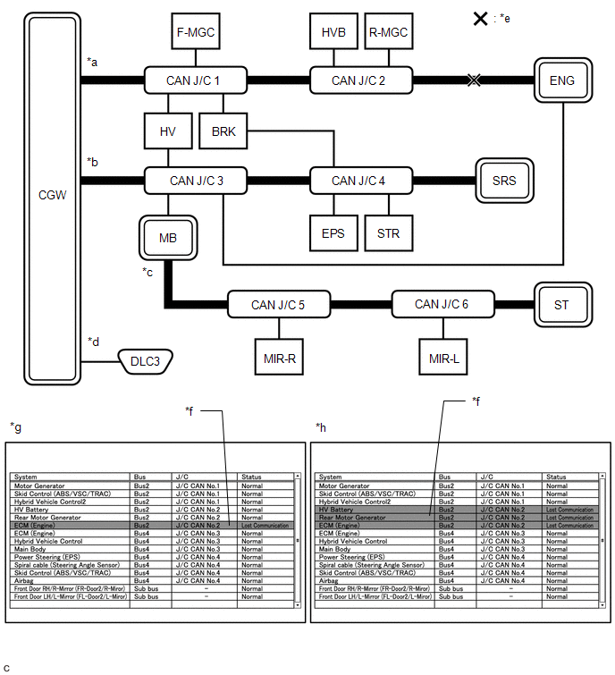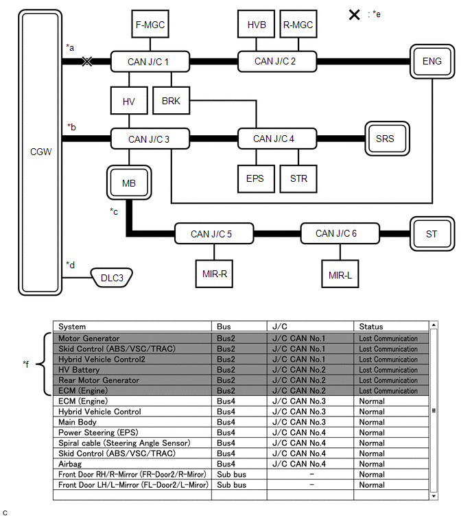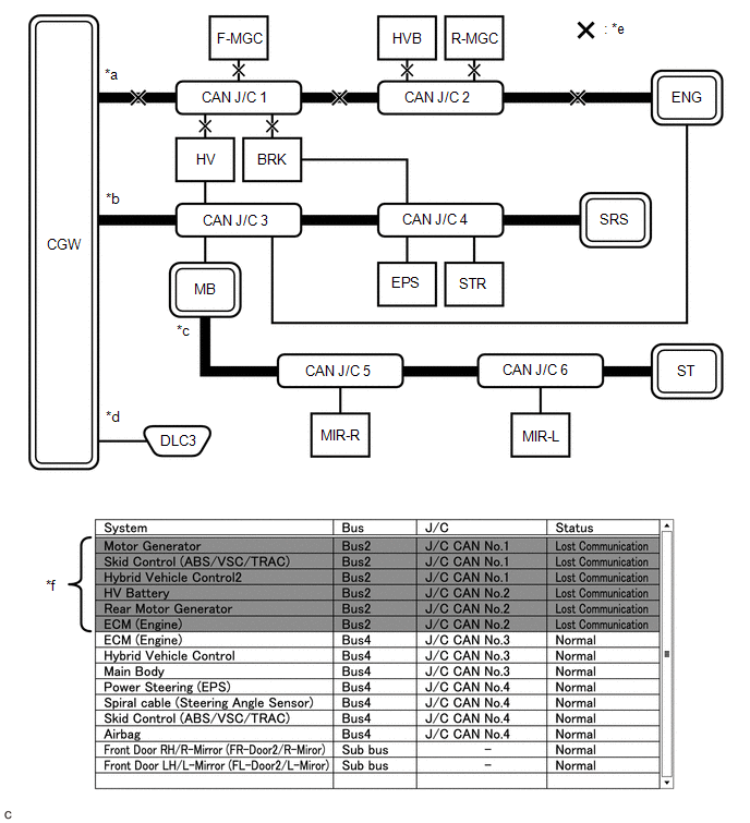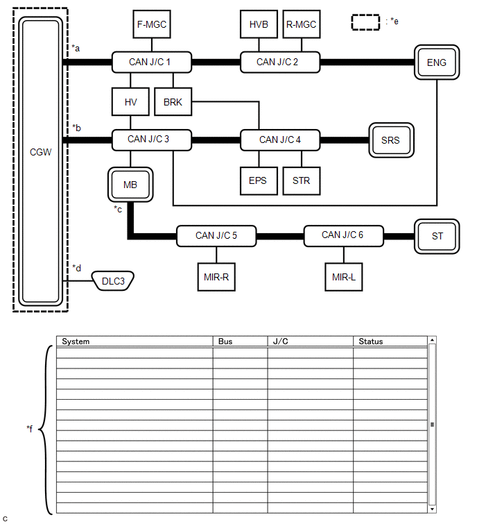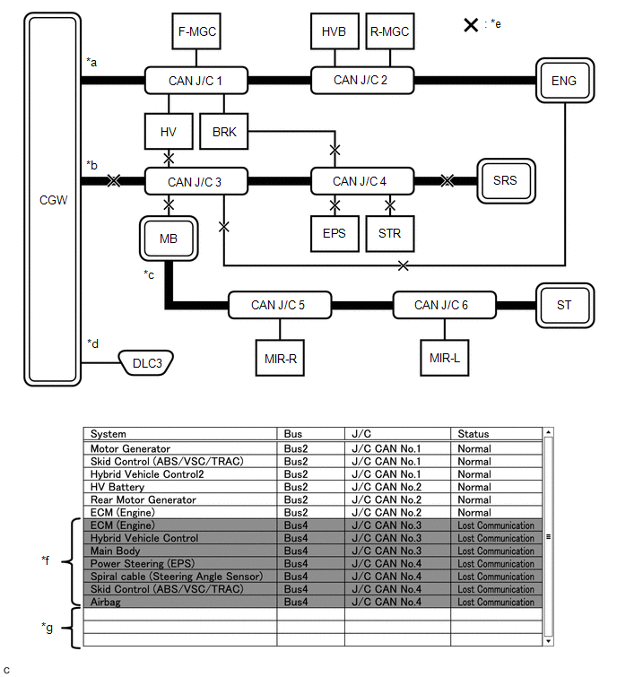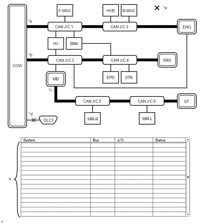 | B | ECUs or sensors farther from the central gateway ECU (network gateway ECU) than the open in the wires are displayed as not communicating on the "Communication Bus Check" screen. | Open in both wires of a main bus line in the central bus |