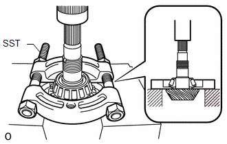 | (a) Using SST, remove the rear drive pinion front tapered roller bearing (inner race) from the rear differential carrier sub-assembly. SST: 09556-30010 |