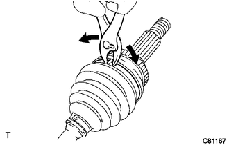 | (b) Using pliers, separate the front No. 2 axle inboard joint boot clamp as shown in the illustration. |