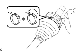 | (2) Using a screwdriver, separate the front No. 2 axle inboard joint boot clamp as shown in the illustration. |