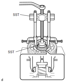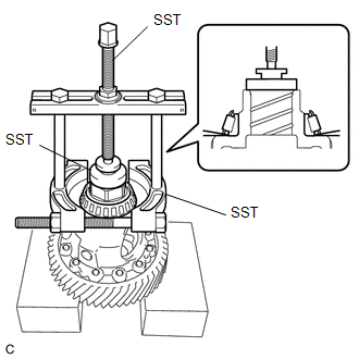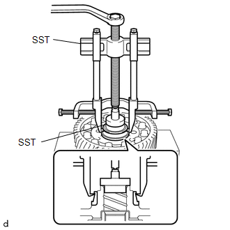 | (a) Using SST, remove the front differential case front tapered roller bearing (inner race) from the differential case assembly. SST: 09950-00020 SST: 09950-00030 SST: 09950-60011 09951-00440 |