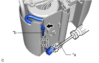 | (d) Using a screwdriver with its tip wrapped with protective tape, disengage the claw. NOTICE: Do not damage the fuel sub-tank. |