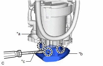 | (g) Using a screwdriver with its tip wrapped with protective tape, disengage the 3 claws, and remove the suction filter from the fuel filter. NOTICE: Do not damage the fuel filter or suction filter. |
