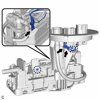 Do not disconnect the tube shown in the illustration when disassembling the fuel suction tube with pump and gauge assembly. Doing so will cause reassembly of the fuel suction tube with pump and gauge assembly to be impossible as the tube is pressed into the fuel suction plate sub-assembly.