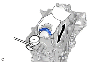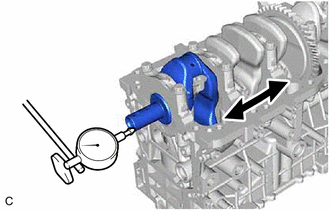 | (a) Using a dial indicator, measure the thrust clearance while moving the connecting rod sub-assembly back and forth. Standard Thrust Clearance: 0.16 to 0.51 mm (0.00630 to 0.0201 in.) Maximum Thrust Clearance: 0.512 mm (0.0202 in.) HINT: If the thrust clearance is more than the maximum, replace the connecting rod. If necessary, replace the crankshaft. |