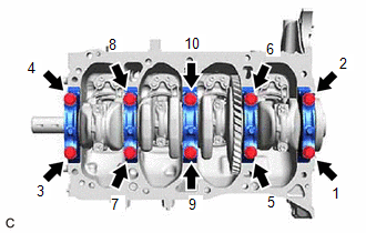| (a) Uniformly loosen and remove the 10 crankshaft bearing cap set bolts in several steps in the order shown in the illustration. |