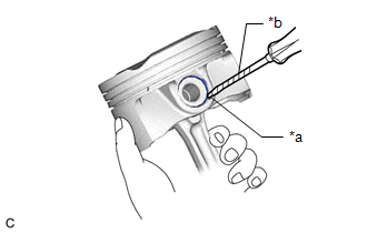 | (a) Using a screwdriver, pry out the 2 piston pin hole snap rings from the piston. HINT: Tape the screwdriver tip before use. |
