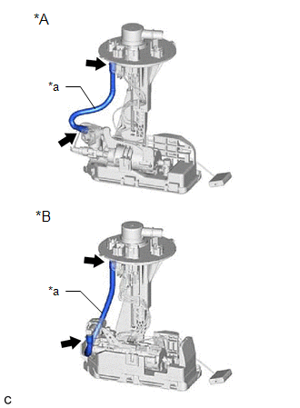 Do not disconnect the tube shown in the illustration when disassembling the fuel suction tube with pump and gauge assembly. Doing so will cause reassembly of the fuel suction tube with pump and gauge assembly to be impossible as the tube is pressed into the fuel suction plate sub-assembly.