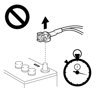 After turning the engine switch (for Gasoline Model) or power switch (for HV Model) off, waiting time may be required before disconnecting the cable from the negative (-) auxiliary battery terminal. Therefore, make sure to read the disconnecting the cable from the negative (-) auxiliary battery terminal notices before proceeding with work.