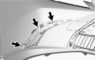 | (b) Disengage the 4 claws and 3 guides to remove the radiator grille garnish sub-assembly LH. |