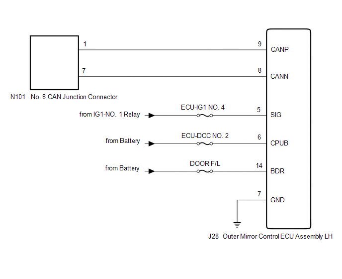 | 1. | CHECK FOR OPEN IN CAN BUS LINES (OUTER MIRROR CONTROL ECU ASSEMBLY LH BRANCH LINE) |