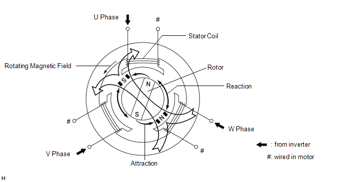 The motor generator control ECU monitors the motor. If the motor generator control ECU detects a reduction in the magnetic force of the motor or an inphase short, it interprets this as a motor malfunction and the motor generator control ECU will illuminate the MIL and store a DTC.