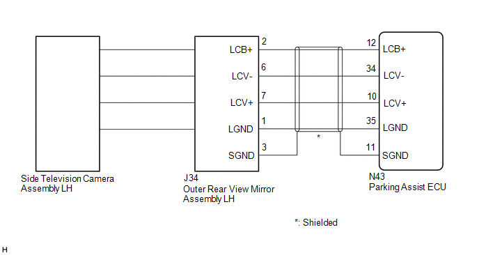 A waterproof connector is used for the side television camera assembly LH. Therefore, inspect the waveform at the parking assist ECU with the connector connected.