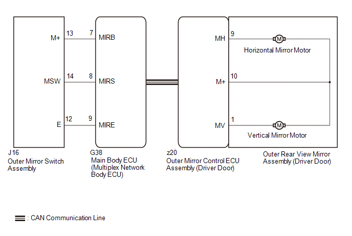 The outer mirror switch assembly sends the mirror adjust switch signals to the main body ECU (multiplex network body ECU). The main body ECU (multiplex network body ECU) then sends the received mirror adjust switch signals to the outer mirror control ECU assembly (driver door) via CAN communication. On receiving the signal, the outer mirror control ECU assembly (driver door) operates the vertical and horizontal mirror motors, which are built into the outer rear view mirror assembly (driver door), to adjust the mirror surface position.