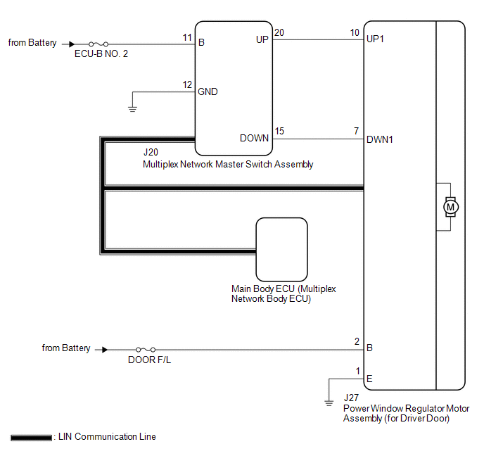 When the engine switch is on (IG), the power window regulator motor assembly (for driver door) is operated by the multiplex network master switch assembly. The power window regulator motor assembly (for driver door) has motor, regulator and ECU functions.