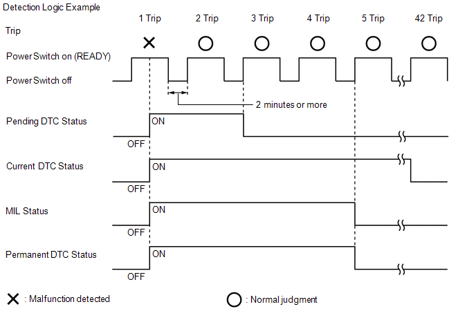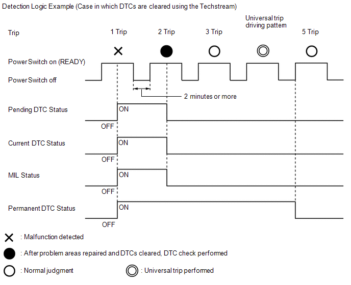 | OFF | Power switch turned on (IG) after normal judgment obtained in 3 consecutive driving cycles or DTCs cleared using Techstream |