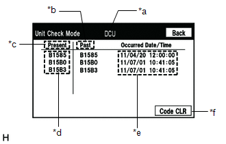 | *e: Timestamp* | The time and date of history DTCs are displayed. (The year is displayed in 2-digit format.) |