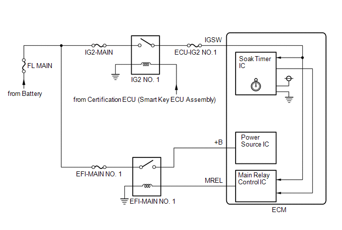 The soak timer operates after the engine switch is turned off. When a certain amount of time has elapsed after turning the engine switch off, the soak timer activates the ECM to perform malfunction checks which can only be performed after the engine is stopped. The soak timer is built into the ECM.