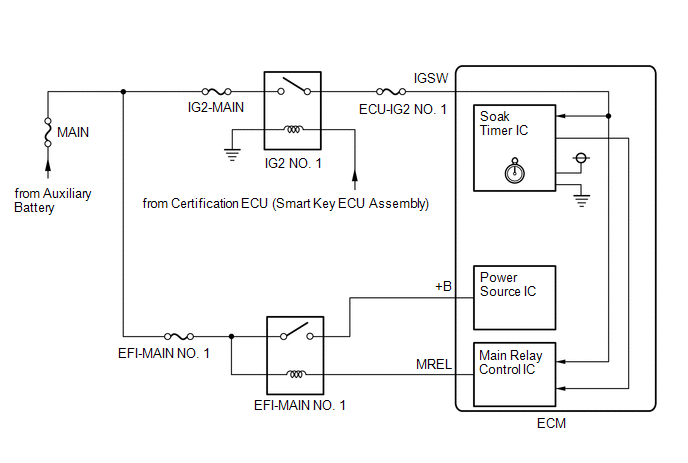 The soak timer operates after the power switch is turned off. When a certain amount of time has elapsed after turning the power switch off, the soak timer activates the ECM to perform malfunction checks which can only be performed after the engine is stopped. The soak timer is built into the ECM.