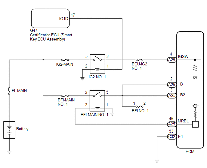 The output signal from the MREL terminal of the ECM causes a current to flow to the coil of the EFI-MAIN NO. 1 relay, closing the contacts and supplying power to terminals +B and +B2 of the ECM.