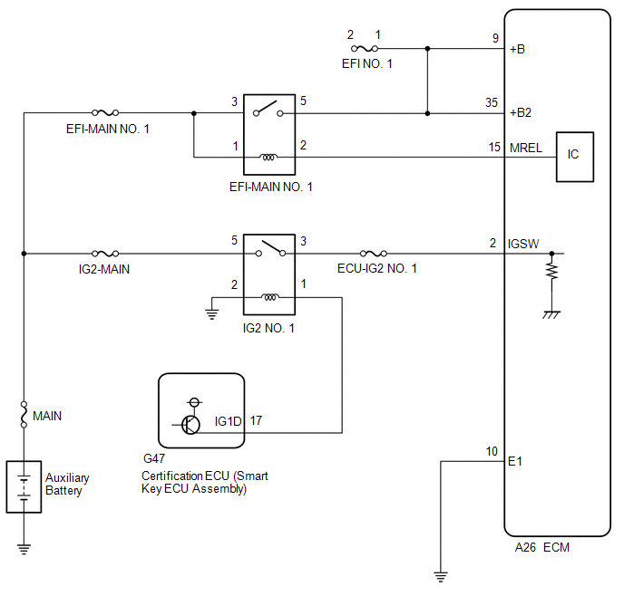 When the power switch is turned to on (IG), the auxiliary battery voltage is applied to IGSW of the ECM. When the transistor in the MREL circuit operates, current flows from the auxiliary battery to ground through the drive circuit of the EFI-MAIN NO. 1 relay, thus operating the relay which supplies power to the +B and +B2 terminals of the ECM.