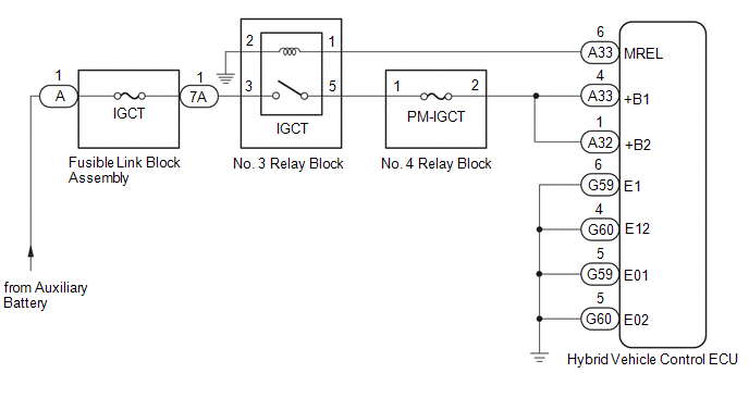 If the power switch is on (IG), the hybrid vehicle control ECU applies current to the MREL terminal to turn the IGCT relay on. This supplies power to the +B1 and +B2 terminals.