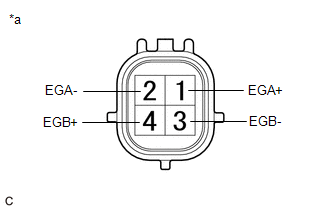 | (a) Measure the resistance according to the value(s) in the table below. Standard Resistance: | Tester Connection | Condition | Specified Condition | | 1 (EGA+) - 2 (EGA-) | 20°C (68°F) | 3.1 to 3.7 Ω | | 3 (EGB-) - 4 (EGB+) | If the result is not as specified, replace the EGR valve assembly. | | | *a | Component without harness connected (EGR Valve Assembly) | | |
