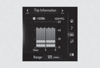 ■ Trip information (type A) Displays the average fuel consumption and regenerated energy for the past 10 minutes in 1 minute intervals, as well as the cruising range.