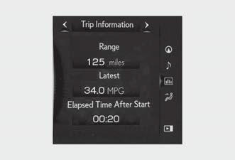 ■ Trip information (type B) Displays the cruising range, latest fuel consumption and the amount of time elapsed since the hybrid system was started.