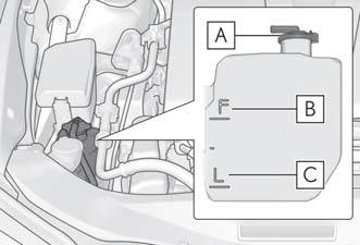 The coolant level is satisfactory if it is between the "F"/"FULL" and "L"/"LOW" lines on the reservoir when the hybrid system is cold.